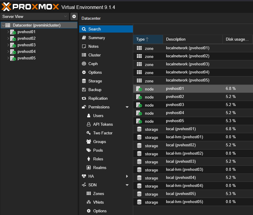 So just a quick overview of my Proxmox cluster so everyone can see what I am doing here, I have a 5 node cluster configured between the (5) mini PCs. No shared storage between them as of yet, but this is the next phase of my mini rack project as I will entertain what storage solution I want to use for shared storage. Also, I am exploring this with Talos as well.