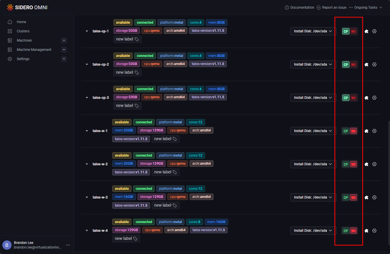 Once you use the customized media to bring up the machines, these will install and report back to Omni and you will see them in inventory. Then all you do is designate which ones you want to be the control plane nodes and the worker nodes.
