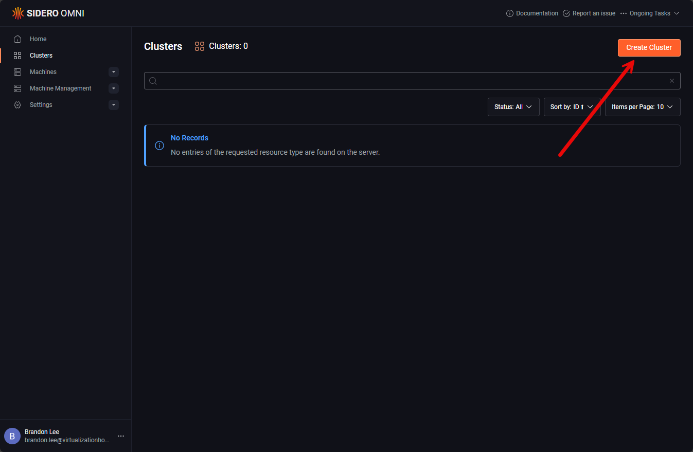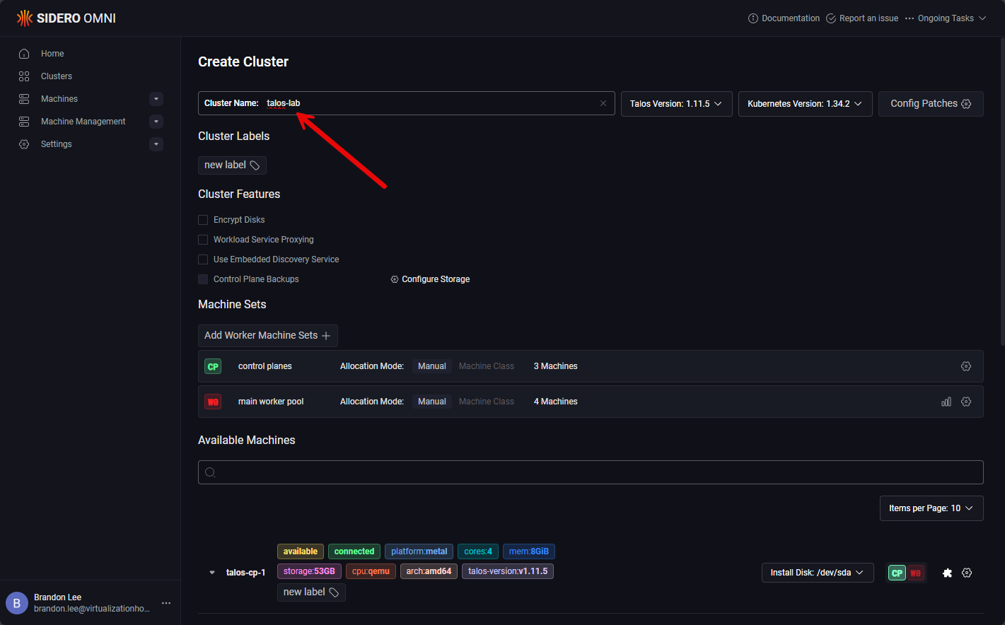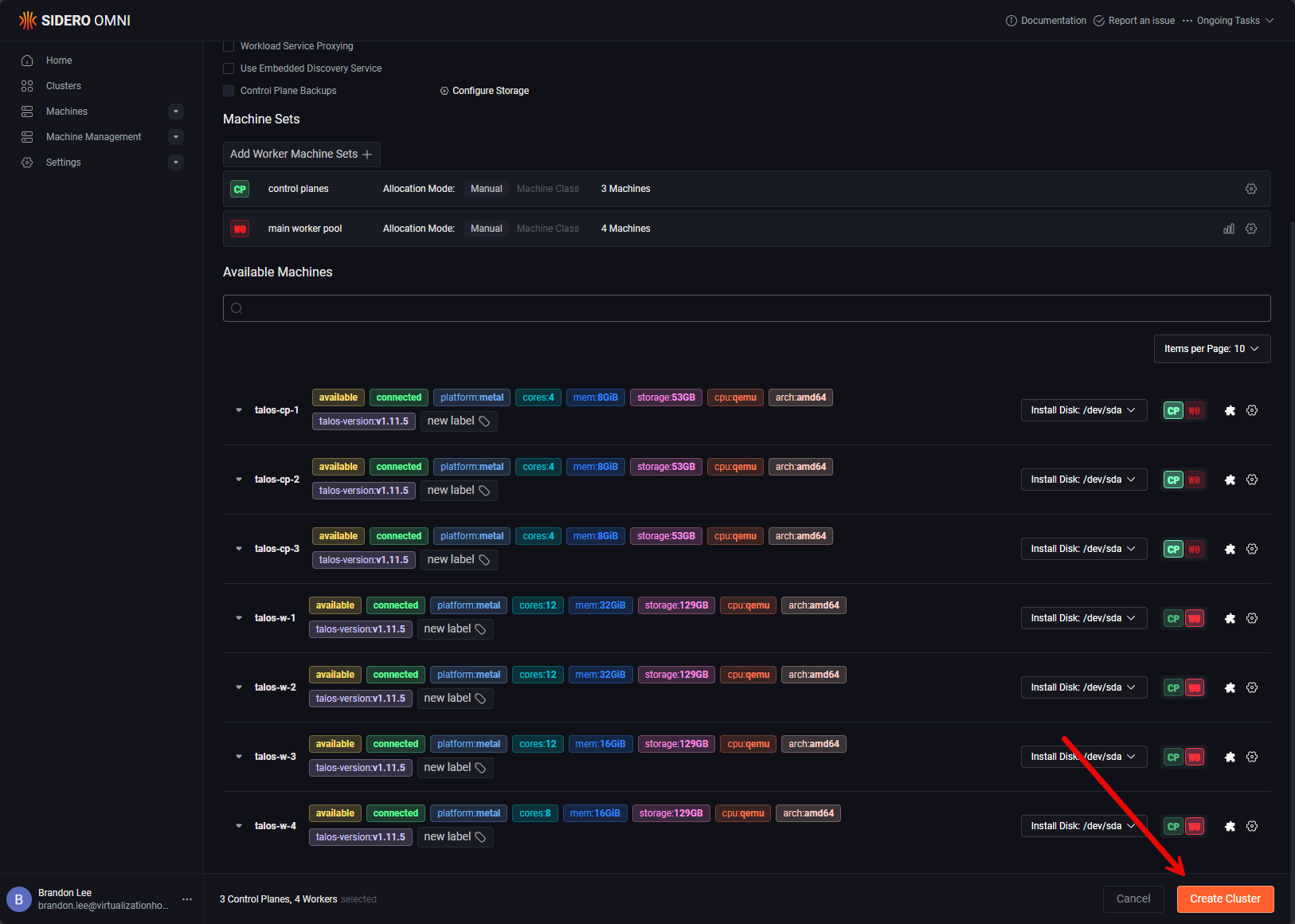 Below, I am creating the Talos cluster using Omni. The Omni management interface makes this extremely easy. Click Clusters > Create Cluster.