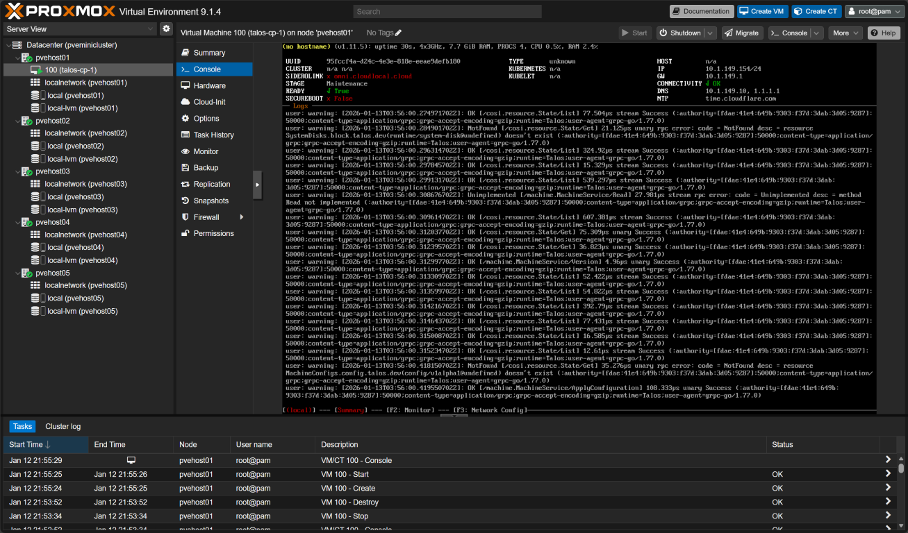 Technically, there are two aspects of shared storage: Proxmox cluster and Talos cluster. You could have shared storage at both levels or shared storage at either level that you want. Since the Talos cluster nodes are running as virtual machines, they aren’t aware of clustering or clustered storage outside of the VM.