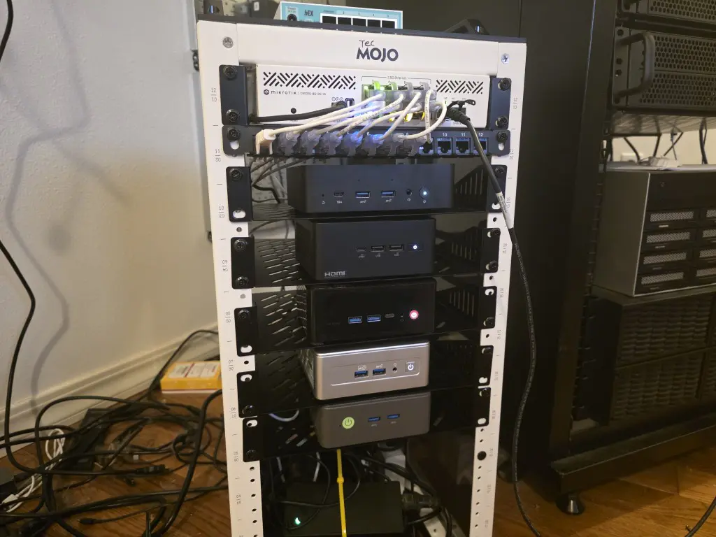 I am running dissimilar hardware across 5 mini pcs as well. So, I had to think about which resources I want to run where as some of the mini PCs have more resources than others (RAM, CPU, etc). Below is a pic of my mini rack along with the Mikrotik networking, etc.