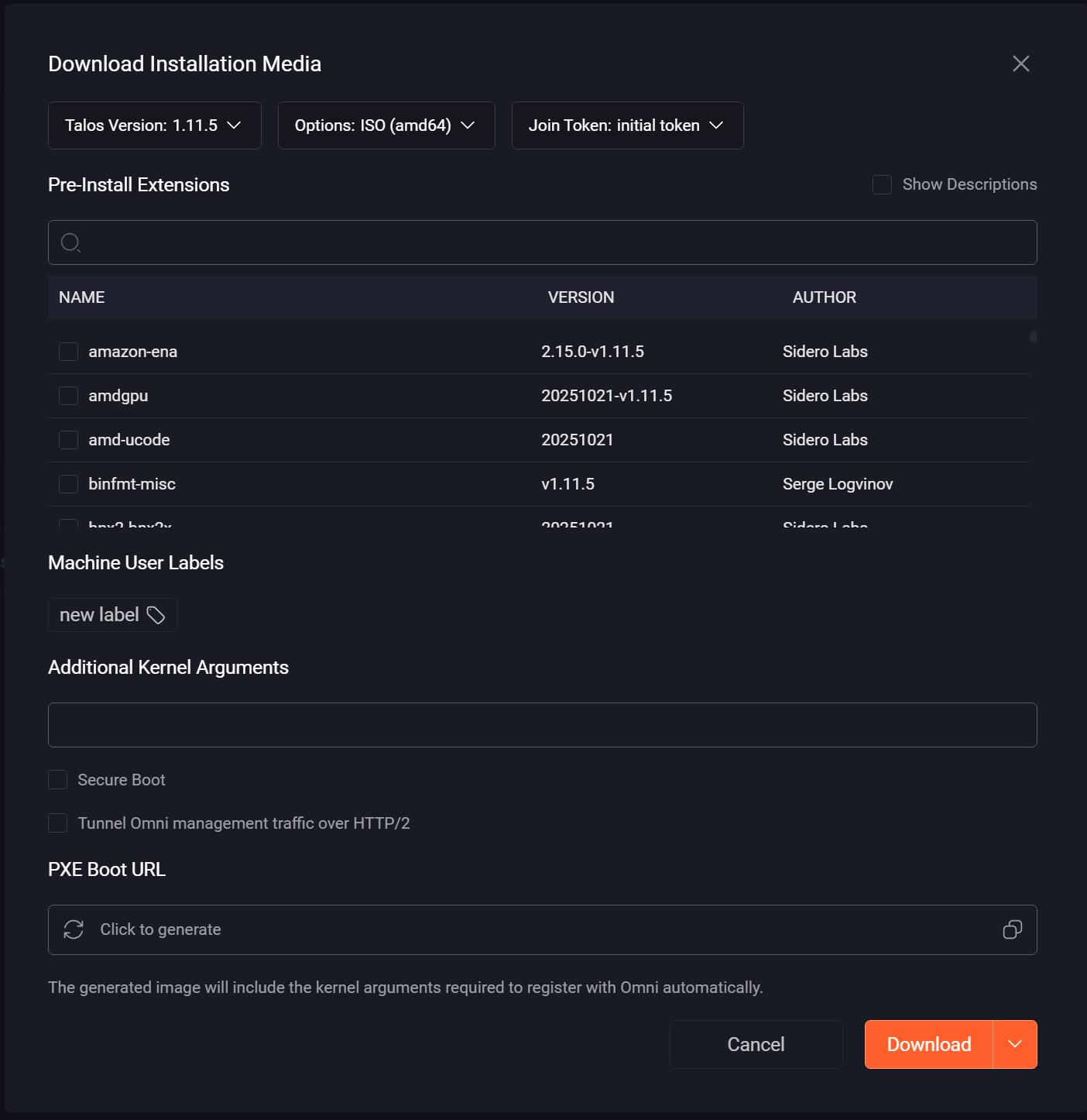 Below, you see the download Installation Media dialog box. This allows you to choose the Talos version, your options for the media, and join token, etc. You can also add extensions for things like storage, etc. I used this to create the installation media and just clicked Download.