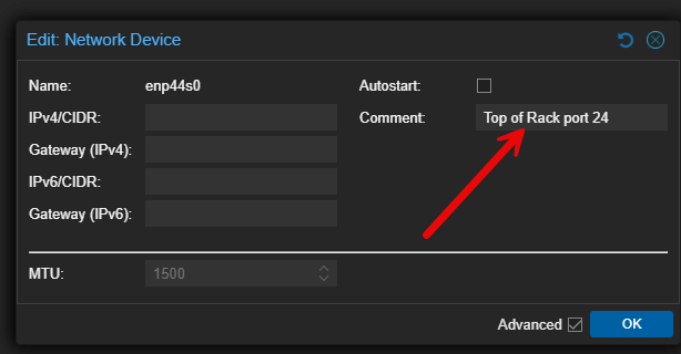 I really like how Proxmox allows you to add comments to many of the components and infrastructure like interfaces and bridges. I learned after a while to take the extra minute to add comments to bridges and network interfaces.