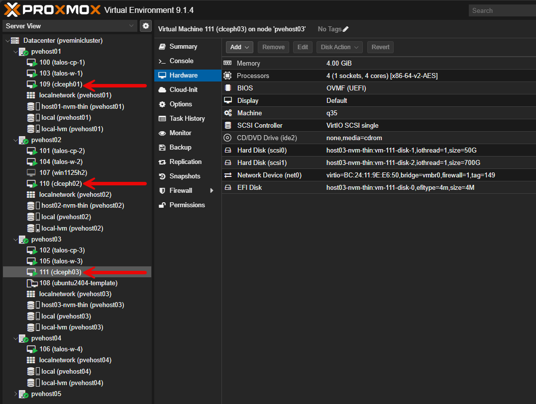 Here you can see how I have the three Ceph virtual machines spread between three different PVE hosts that are mini PCs in the minilab cluster.