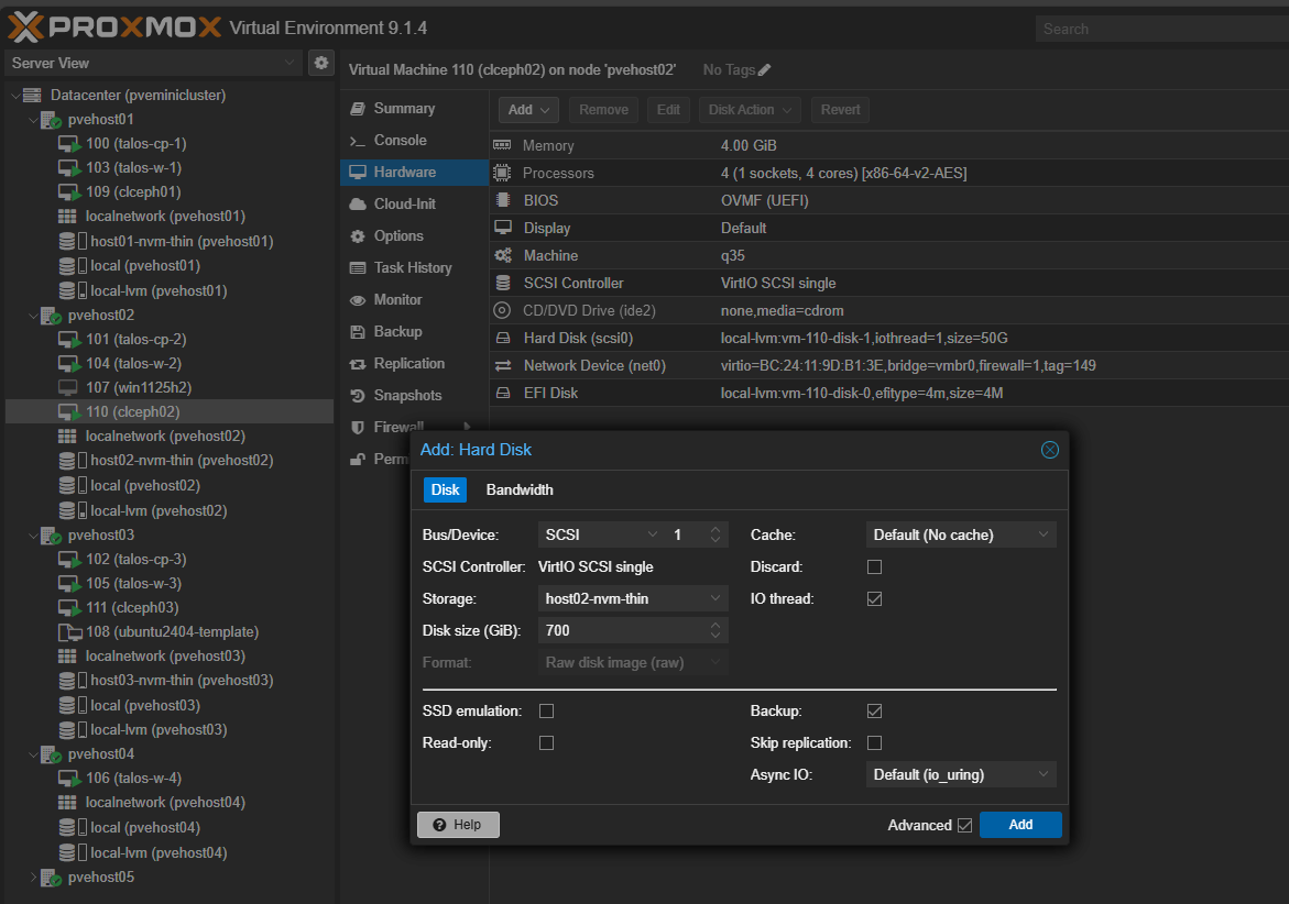 So unlike my Docker Swarm hosts, I couldn’t run Ceph directly on the Talos nodes since they are immutable. So, what I decided to do was have a separate cluster of three Ubuntu Server 24.04 virtual machines. Each VM has a dedicated NVMe disk attached to the virtual machine. These are backed by physical drives in my mini PC hosts.