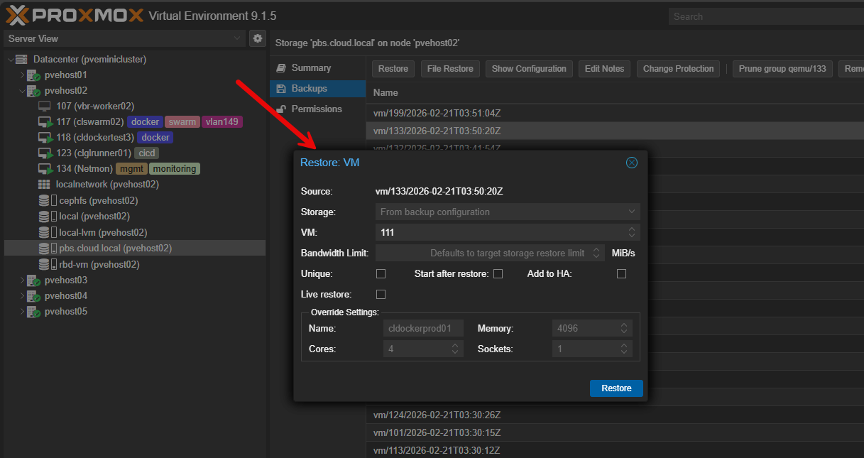 Solutions like PBS have file-level restores. Test these also. Browse the backup catalog and make sure you understand how to navigate your backup software and restore things under calm circumstances. The whole point of this Proxmox maintenance task exercise is to discover any problems BEFORE you are actually in a real outage or have lost data due to something crashing, a hardware failure, or something else.