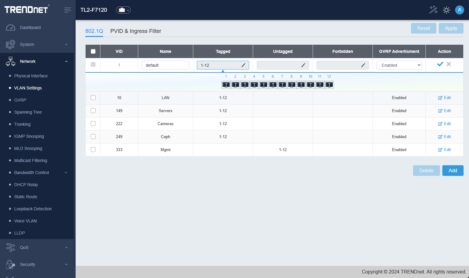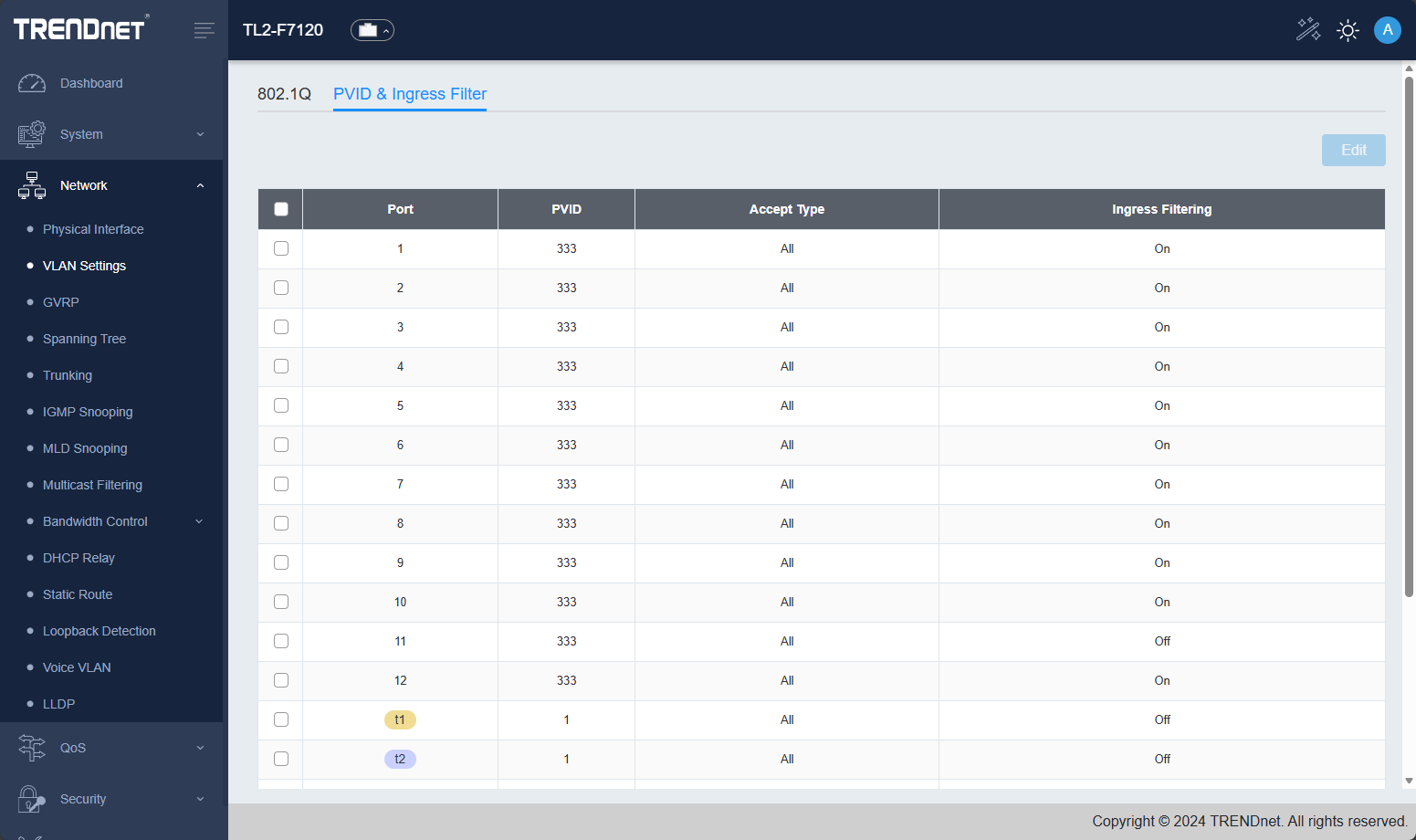 Below you can see the PVID and Ingress Filter screen.