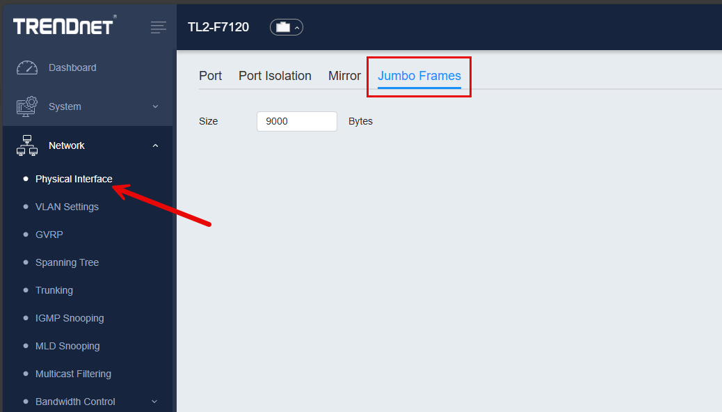 When you are talking about software-defined storage or virtualization storage technologies, they definitely love Jumbo frames. Jumbo frames help to make network communication with large traffic flows much more efficient. It can also lower CPU use. The trendnet switch supports jumbo frames up to 10 KB.