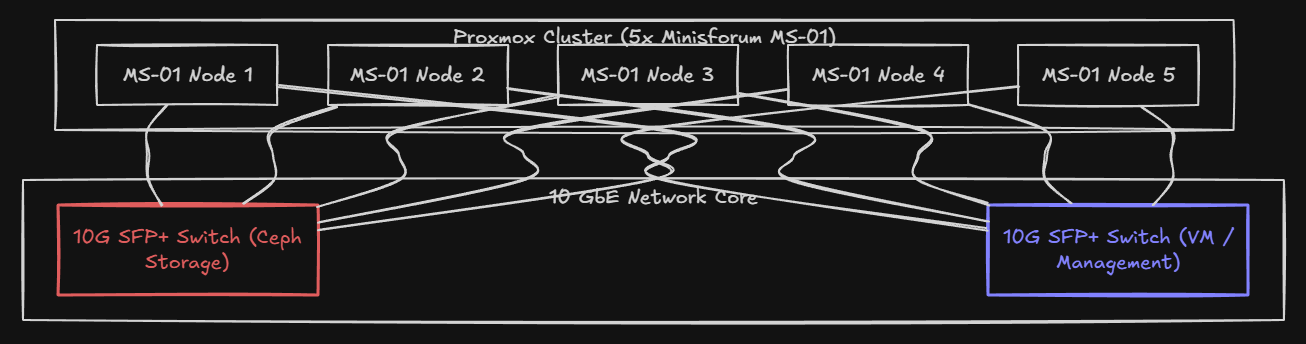 Since the MS-01 has a wealth of network connectivity with (2) 10 gig SFPs, my plan became not only to step up to 10 gig, but to also separate out the traffic for Ceph to its own 10 gig link and then have 10 gig for all other traffic types. So: