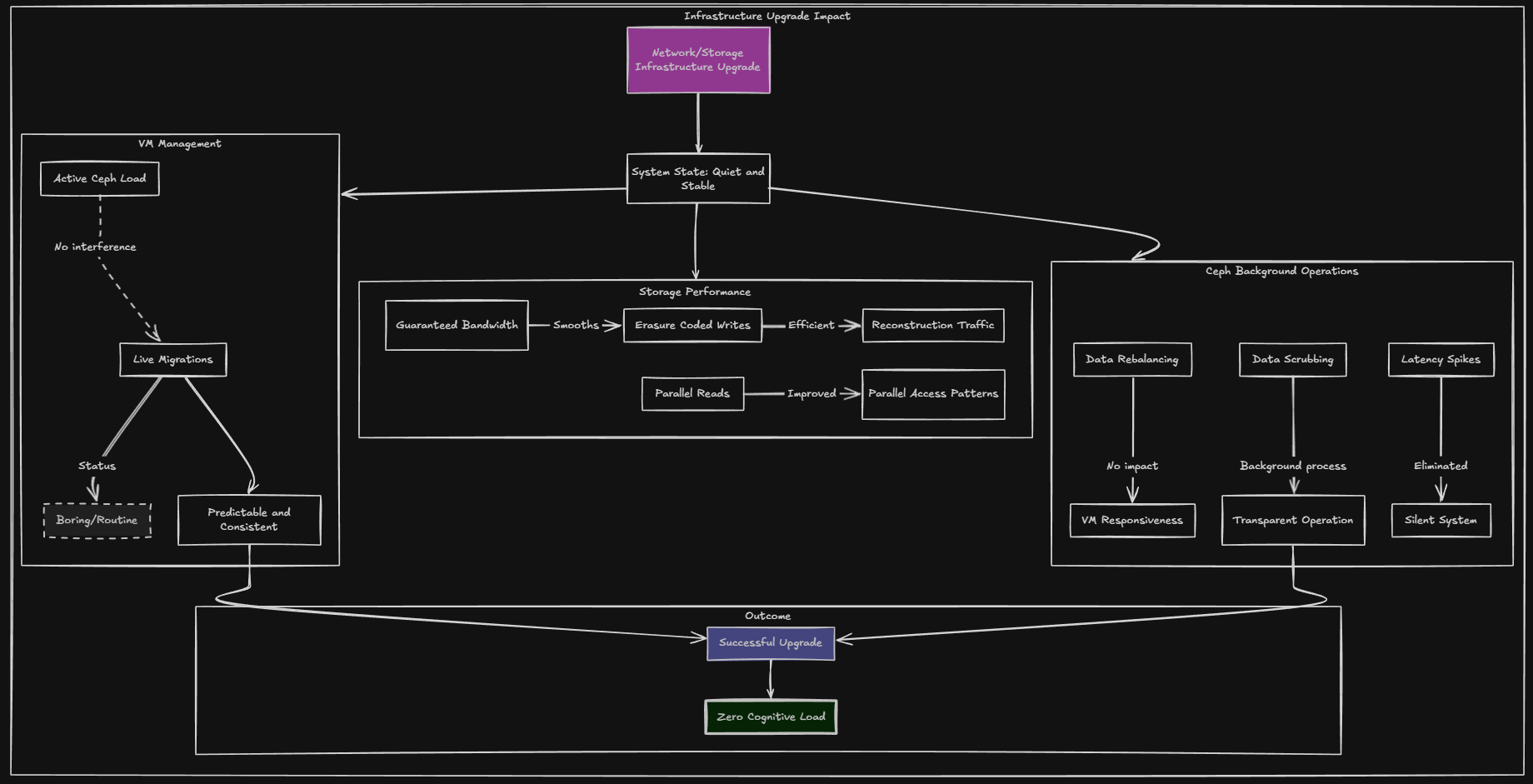 Ceph activity stopped impacting anything or causing latency spikes. Rebalances run with absolutely zero impact on VM responsiveness. Scrubs happen in the background and are something that I no longer “feel” or notice in other ways.