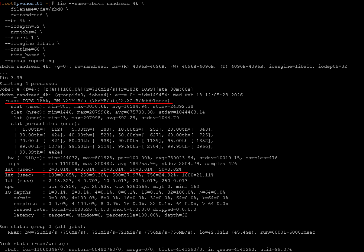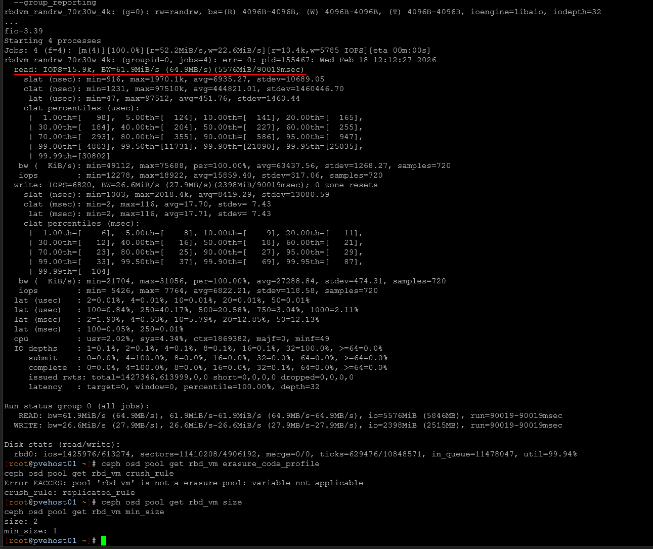 This is where you see the most demanding workload for distributed storage in random writes. Each write must be replicated and committed before acknowledgment. With replication size 2 and live VM load in the cluster with 22 VMs running, this latency profile is very good. The important thing I observed is stability. There were no latency collapses or cluster health issues during the load test.