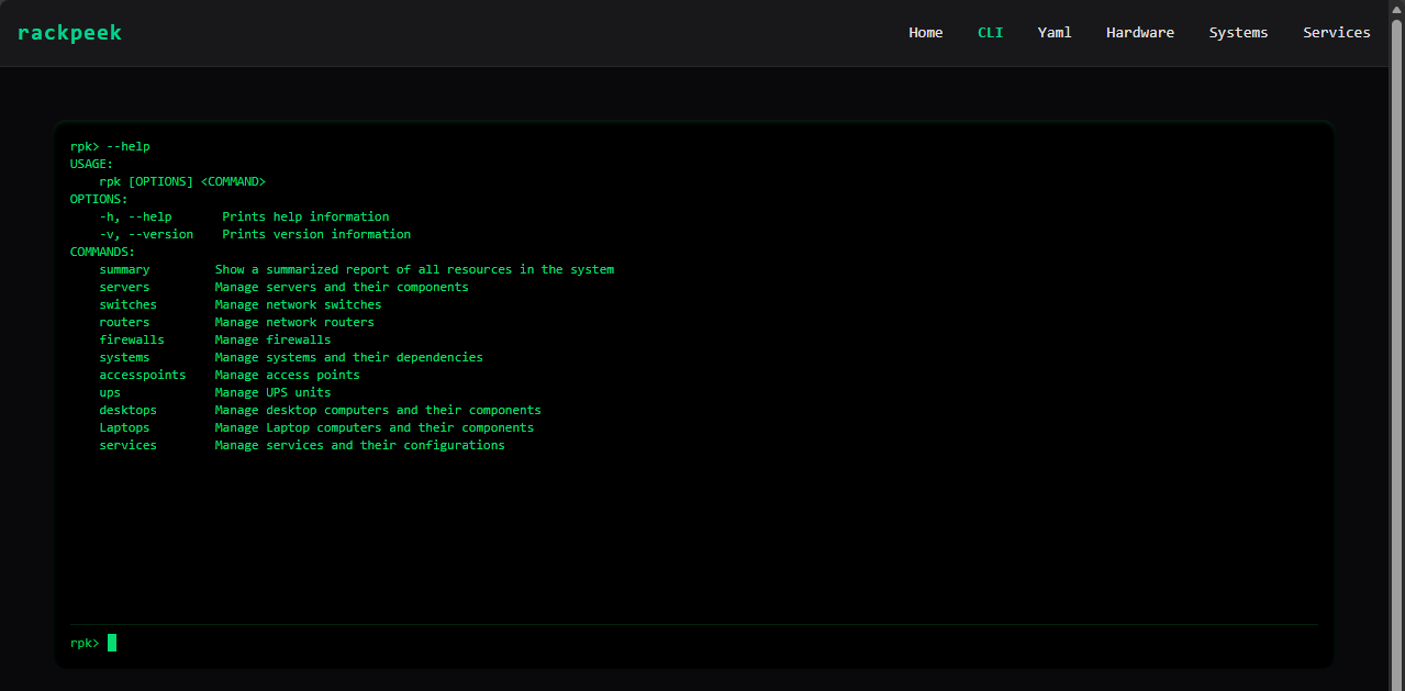 RackPeek also has a very neat CLI emulator that allows you the ability to enter CLI commands and input, edit, and view information from the YAML file it creates underneath the hood. You can view the CLI commands you can use by entering the –help parameter at the rpk command line.