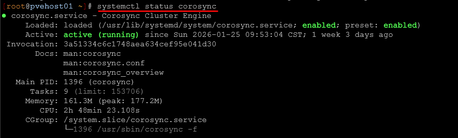 Below is just a look at checking the status of Corosync service with systemctl.
