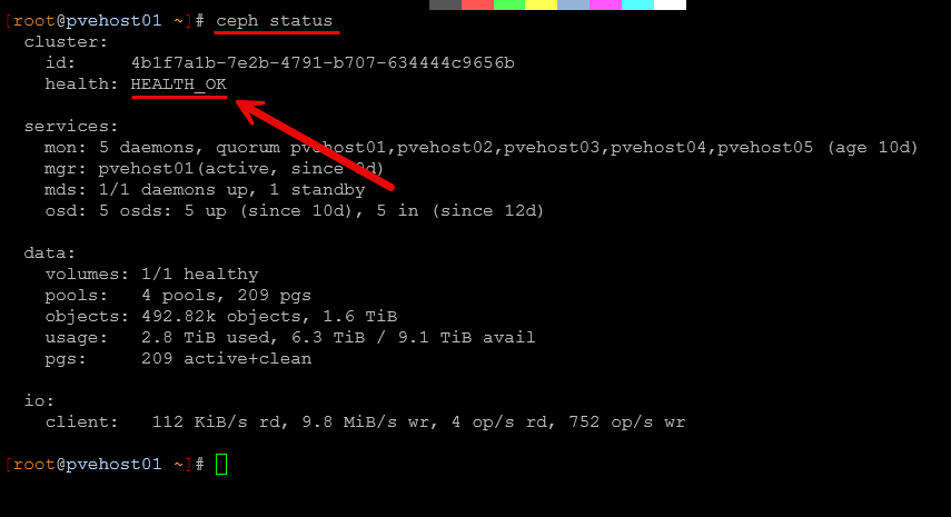 As a final verification that both the Proxmox clustering and Ceph cluster are back online and healthy, you can run the following: