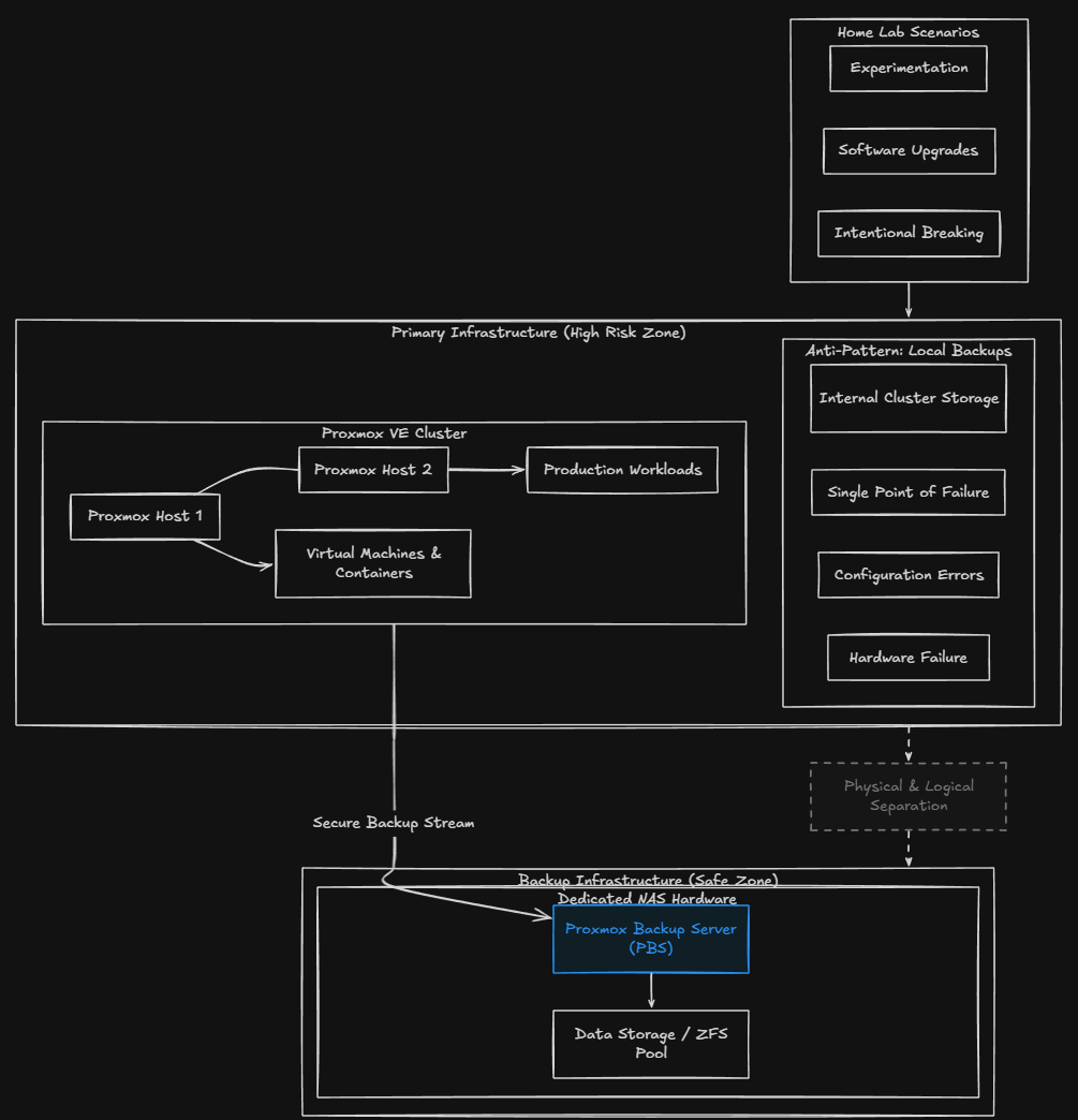 In a home lab situation, we are experimenting, changing things constantly, upgrading software, hardware, and many other things. And, we break things on purpose! Having backups that are outside the blast radius of your immediate home lab infrastructure helps to give you confidence to try new things knowing you have the safety net of backed up data.