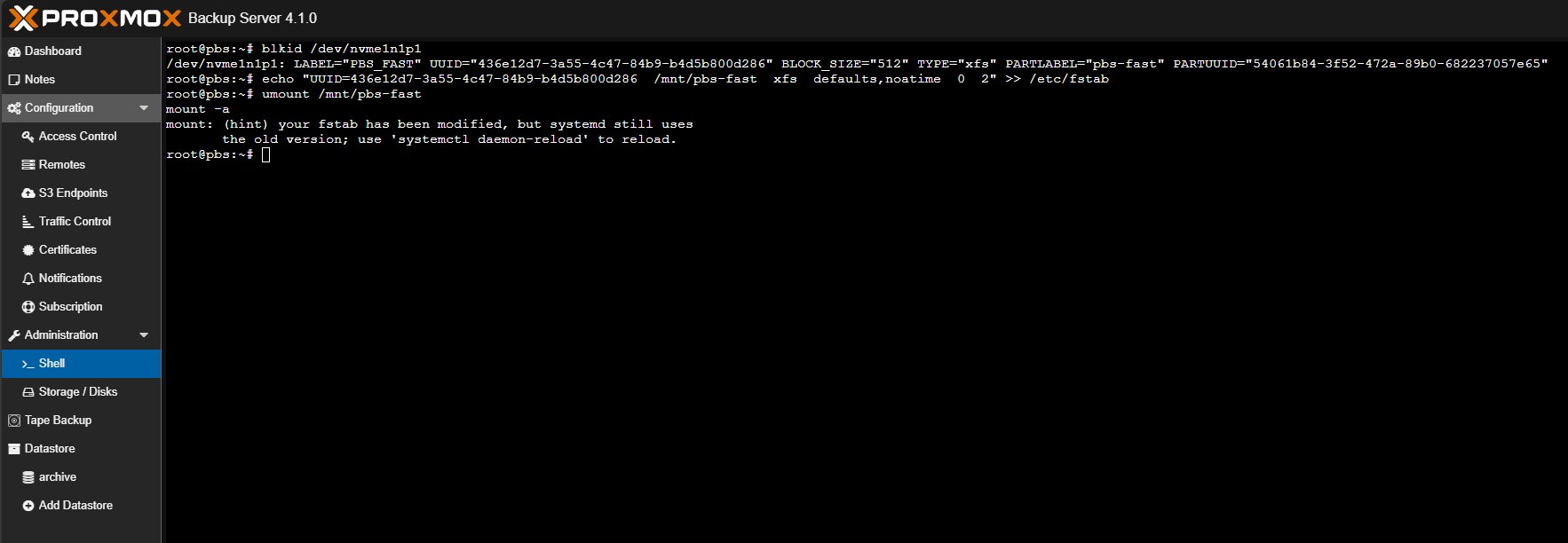 echo "UUID=436e12d7-3a55-4c47-84b9-b4d5b800d286 /mnt/pbs-fast xfs defaults,noatime 0 2" >> /etc/fstab