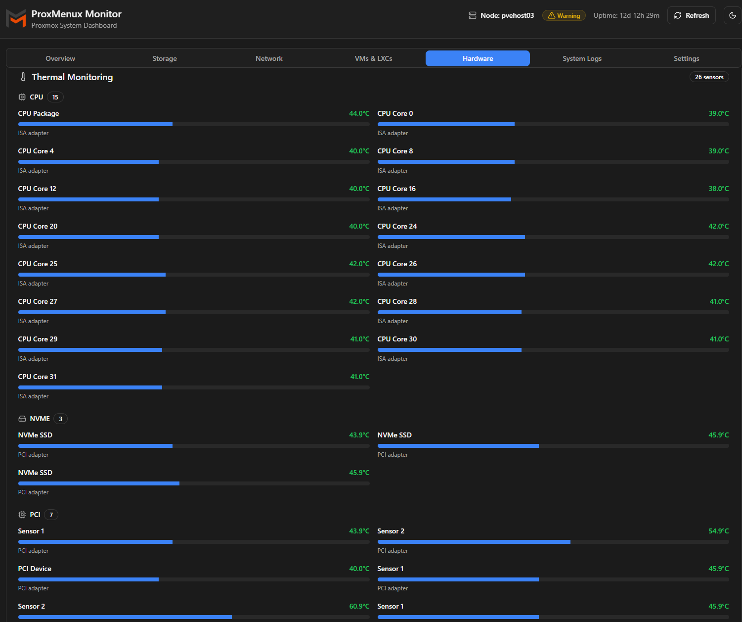 Check out my full post covering this project here: How I Fixed Heat Buildup in My 10-Inch Mini Rack with a Simple Cooling Mod. I saw much better temps across the hardware in each of my mini pcs after doing this. Below is a look at my temps on one of the mini PCs using ProxMenux: