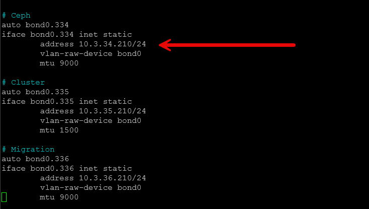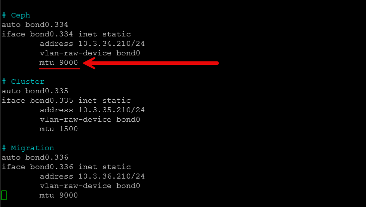 Another network setting that I always configure having to do with storage (Ceph, iSCSI, NFS) is turning on jumbo frames. When you enable jumbo frames, this helps to improve the performance of your storage traffic and it will help to lower the CPU use at the same time.
