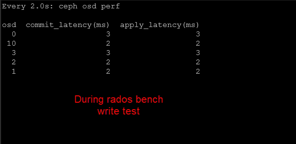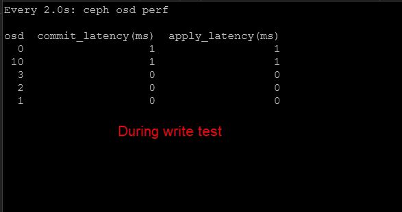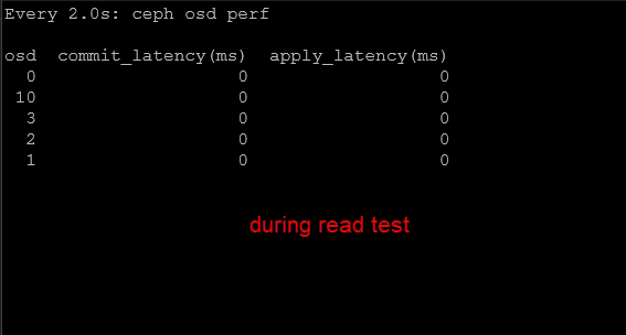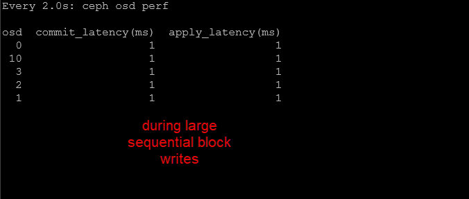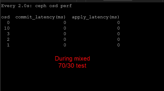 Below, as a quick foreshadowing of what the testing resulted in, the drives with more than 0 value are consumer drives. The ones with zeroes are enterprise drives. The ceph osd perf command measures drive latency. As you can see, the enterprise drives trounce consumer drives in terms of latency and this is important as we will see.