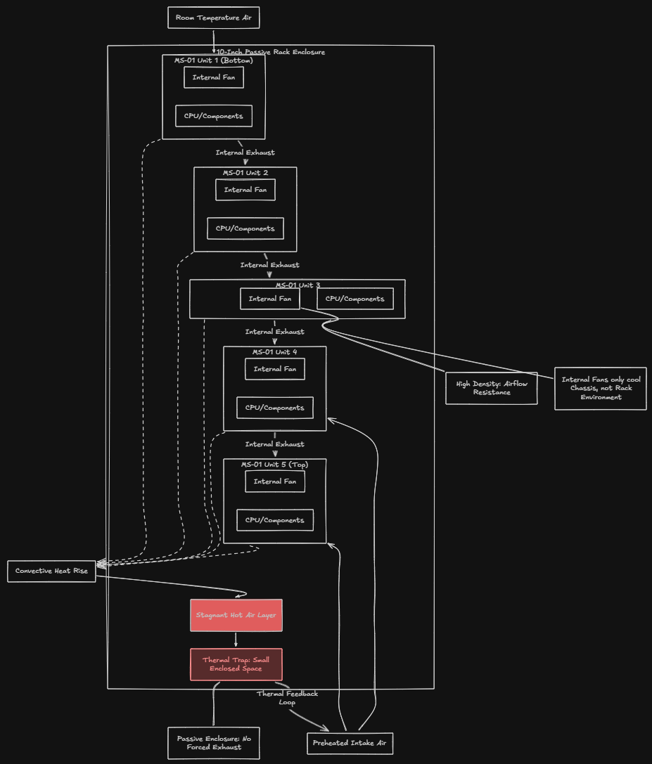 The MS-01 systems have their own internal cooling fans, but they are cooling themselves, not the shared air environment inside the rack. And, they are super dense so air can’t really “move” a hot, outside of just getting exhausted out of the chassis. Over time, the air inside the rack becomes warmer than room temperature, much warmer. And every system is now pulling in preheated air as the heated air is going to leak around the outside of the rack enclosure and underneath the mini PC above it. That reduces cooling efficiency and increases fan speeds across all nodes.