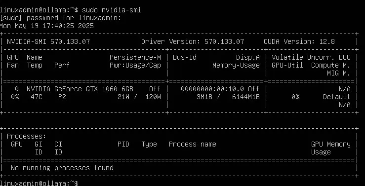 After booting the system, the first thing I wanted to verify was whether the operating system could see the GPU. One of the easiest ways to check this is with the lspci command.
