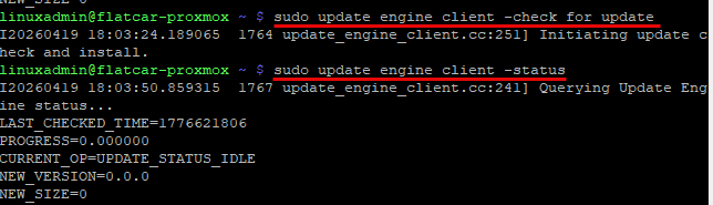 The updating of Flatcar shines as well. It is immutable by nature so updates are applied in the inactive partition by default. The workflow looks like this: