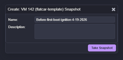 qm create 142 --name flatcar-template --memory 4096 --cores 2 --net0 virtio,bridge=vmbr149