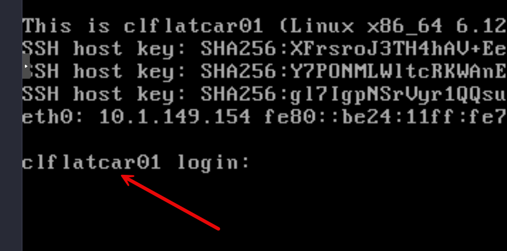 At this point, once you have your ignition file in place and you have taken a snapshot, you can power on the virtual machine and verify the ignition file is injected into Flatcar. After powering my Flatcar VM on, after just a few seconds after boot it gets to a prompt and I see the hostname has been customized which is a good sign.