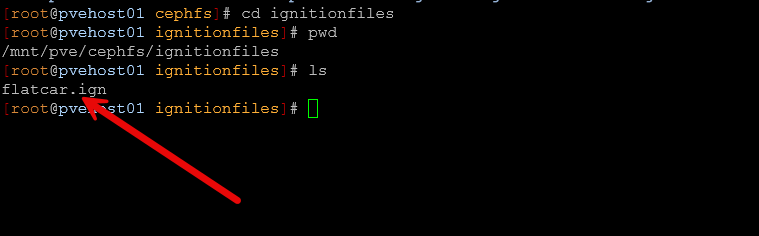 So, we need the ability to have Proxmox have access to our ignition file. So, what I did in my setup was hosted the ignition file in my CephFS pool since this is accessible to all my hosts. I created a folder called ignitionfiles in the root of my CephFS pool: