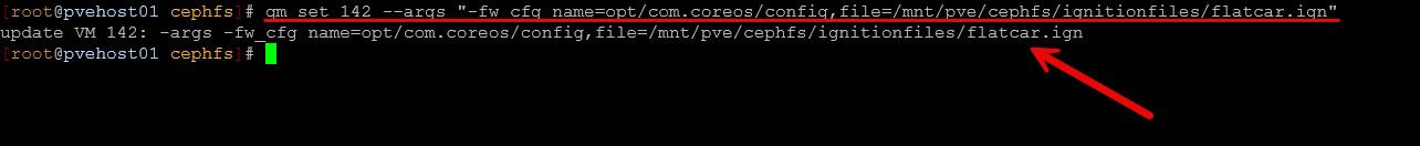 qm set 142 --args '-fw_cfg name=opt/com.coreos/config,file=/mnt/pve/cephfs/ignitionfiles/flatcar.ign'