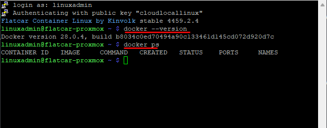 Also, I wanted to check out docker after getting flatcar spun up. It looks like the current stable release contains Docker version 28.x which is recent and it looks like all the docker related commands work as expected with Docker already installed and ready to go.