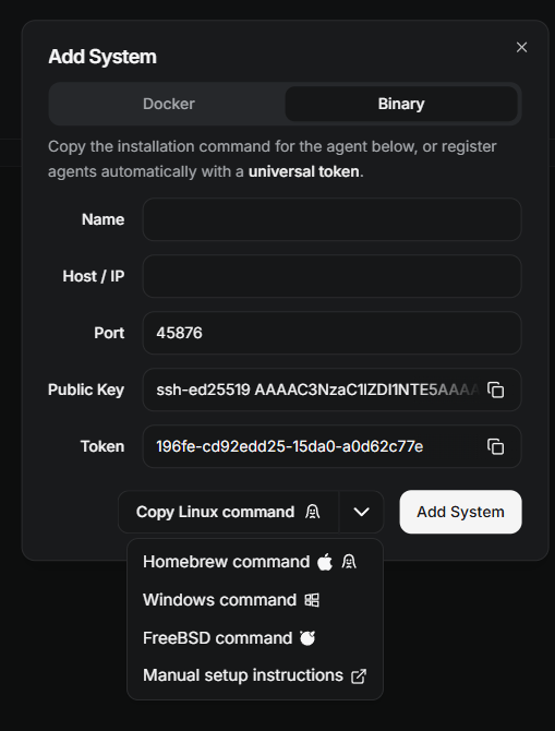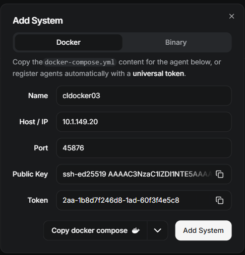 After you click the button, it will launch the Add System dialog box. Here you have two choices. You can add a system by running the Beszel Docker agent container, or you can add it using the installable binary for non Docker hosts.
