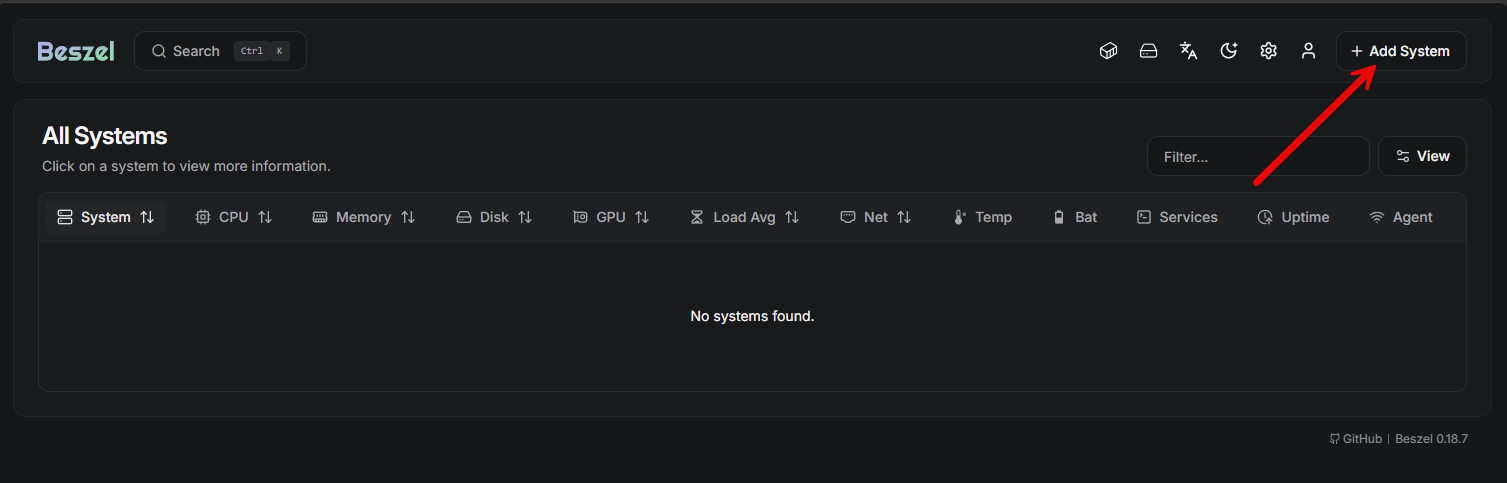 Once you create the first admin account from the dialog box above, you then will see the blank Beszel dashboard where you can add your first system. Here you will click the + Add System button in the upper right-hand corner.