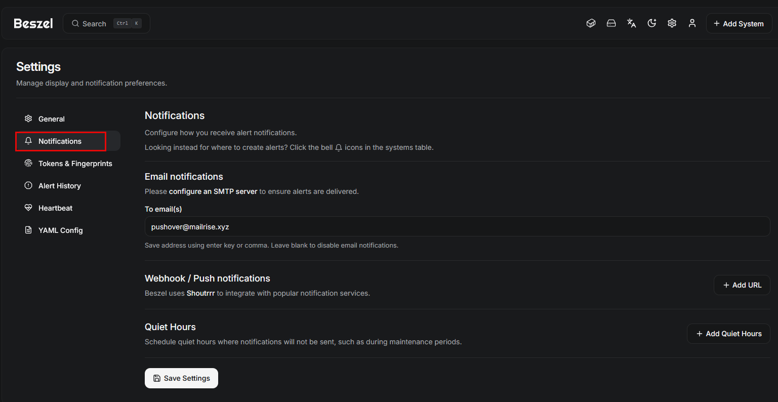 Configuring the notifications for alerting is found under the “settings” of the Beszel hub. Click Notifications: