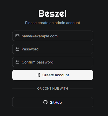 Now, all we need to do is browse out to our Docker host on port 8090. You will be prompted to create your admin account for Beszel. Enter an email address and then create a password and confirm it. You can also use your GitHub account also.