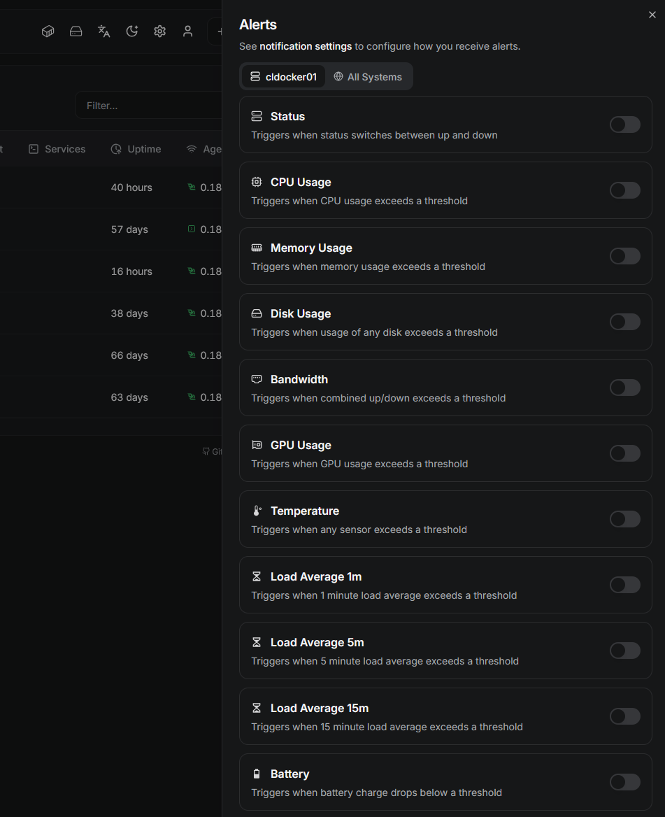 A good monitoring solution has a means to notify you when thresholds reach a certain metric where it triggers an alert. Beszel has a very simple but effective alerting solution built into the platform. You can easily turn on alerts globally or in a granular fashion for each “system” you add to the hub.