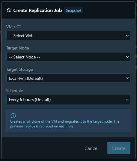 In PegaProx underneath the Datacenter options for your cluster, there is the Replication menu. In looking at the replication options there, PegaProx actually has an option to use what they just refer to as Snapshot replication. The description for this replication type is this: