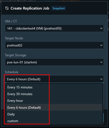 Note below, the target storage I have selected is an iSCSI LUN and not ZFS. The Scheduling options are also interesting. The default setting is every 6 hours. But as you can see you have the options: