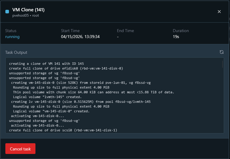 This will kick the task off. You can select the task in PegaProx and view the status of the job.