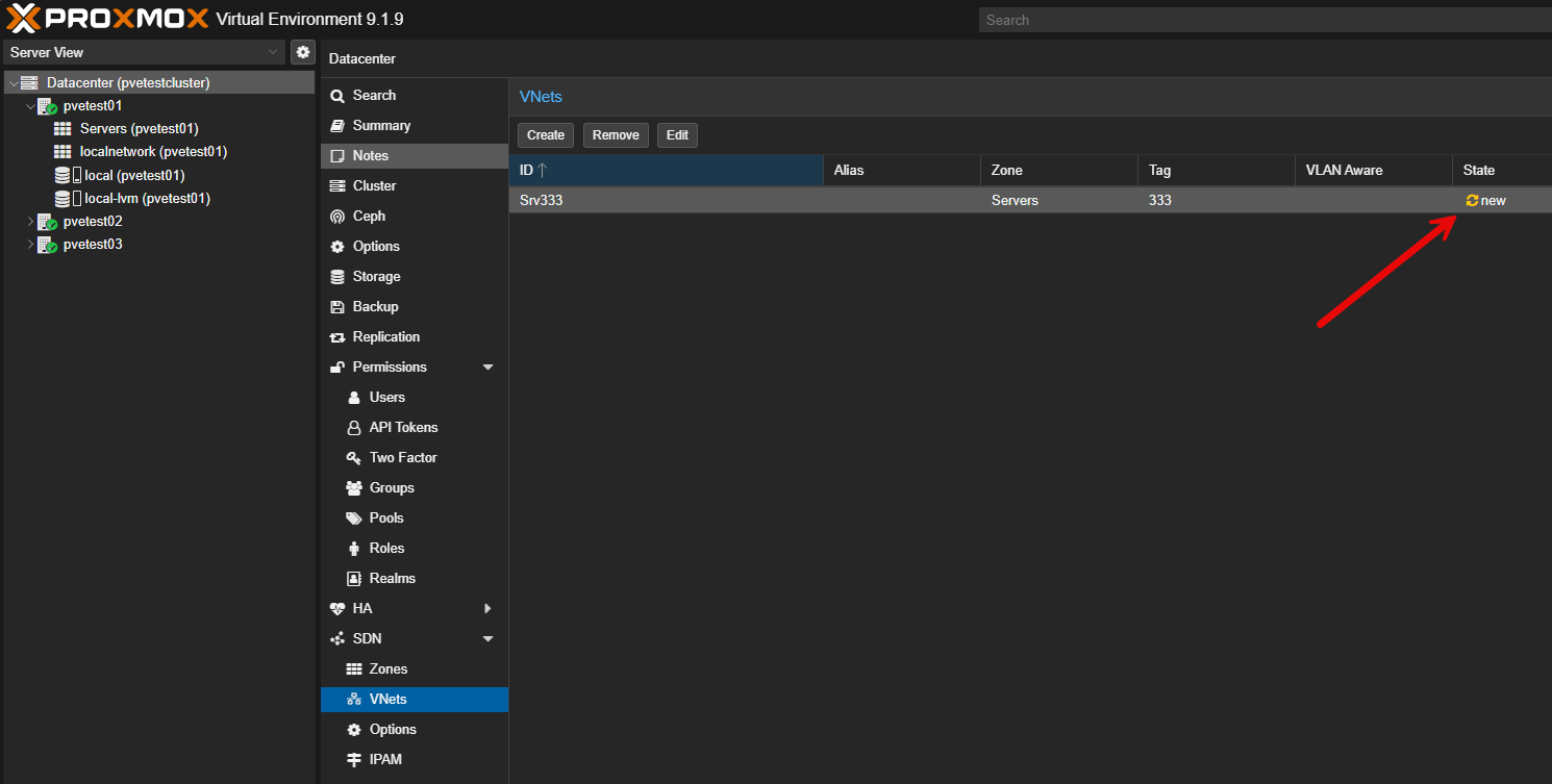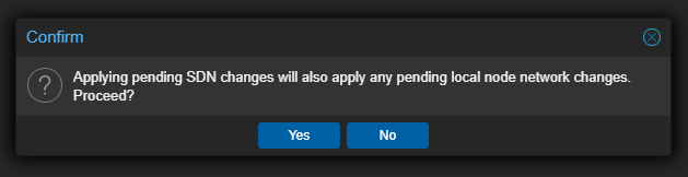 Don’t forget to apply the configuration. Everything you do in the Proxmox SDN configuration is first “staged” and isn’t live until you apply the configuration.