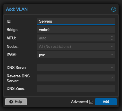 On the Add: VLAN box, you enter the ID, underlying bridge for the VLAN, MTU if you need it, and which nodes that it is scoped to.