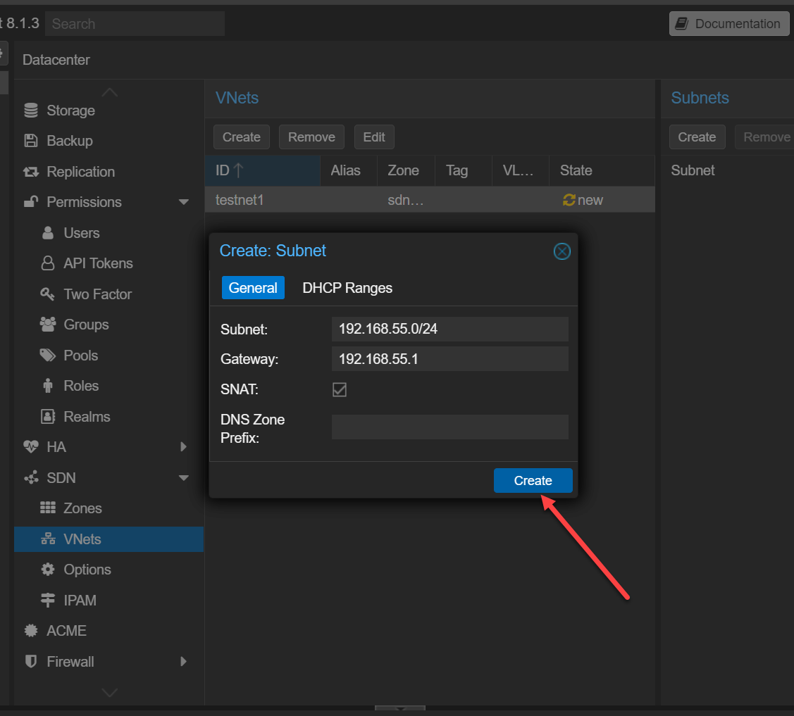 Here we are creating the subnet and notice that we are enabling SNAT which allows machines on this vnet to be able to assume the source NAT of the Proxmox VE Server host: