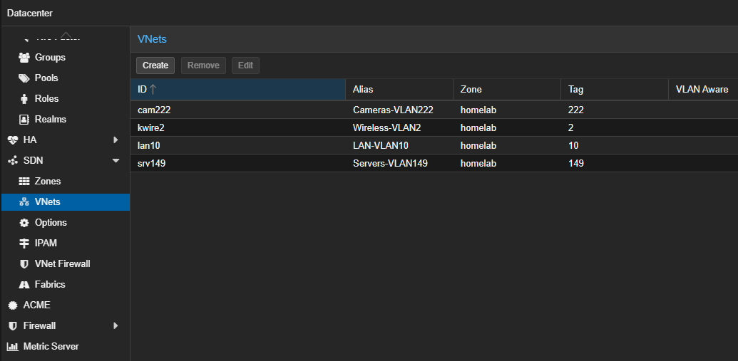 I initially used traditional Linux bridges in my environment, but this was super tedious as I had to literally create the configurations for a handful of VLANs on each host. However, moving to SDN, I just created it once in the Datacenter > SDN configuration and this is pushed out to all the hosts.