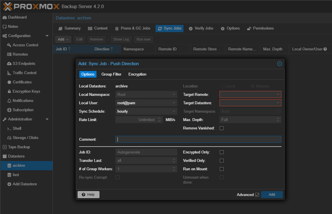 In a real-world scenario, you might have a local Proxmox Backup Server in your home lab and a second instance running on a small VPS or remote location. Now you can enable encryption and even if that remote system is compromised, your backup data is still protected.