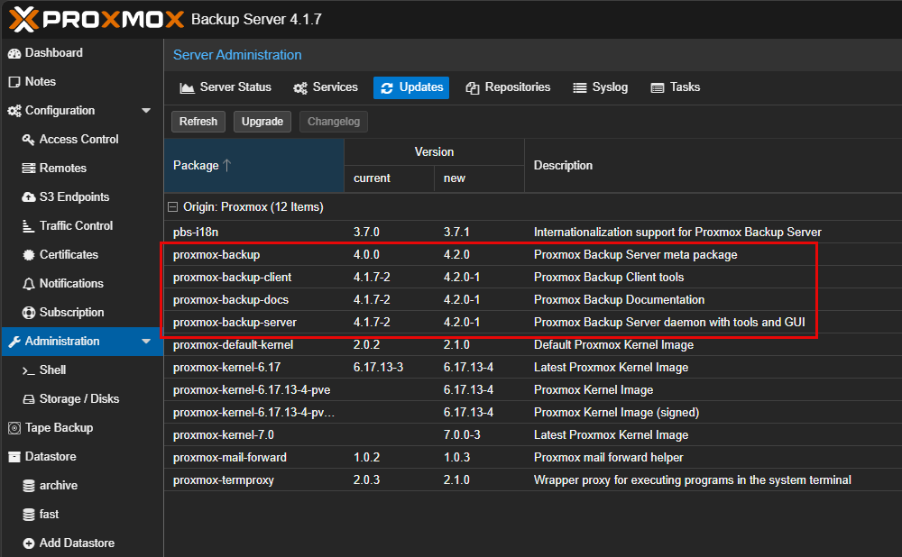 After refreshing, we see Proxmox Backup Server 4.2 bits are available. Click the Upgrade button.