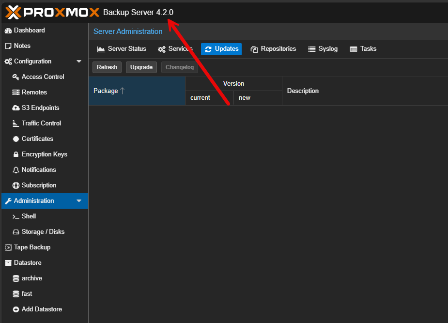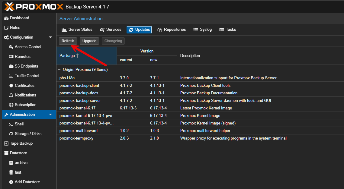 A quick look at the upgrade process for Proxmox Backup Server. To get version 4.2, you can simply navigate to Administration > Updates. Here you will need to hit the Refresh button to reach out and pull the latest updates that are available.