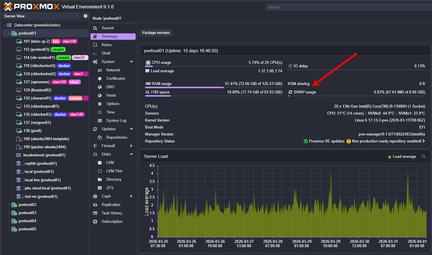 - Proxmox node summary for memory pressure