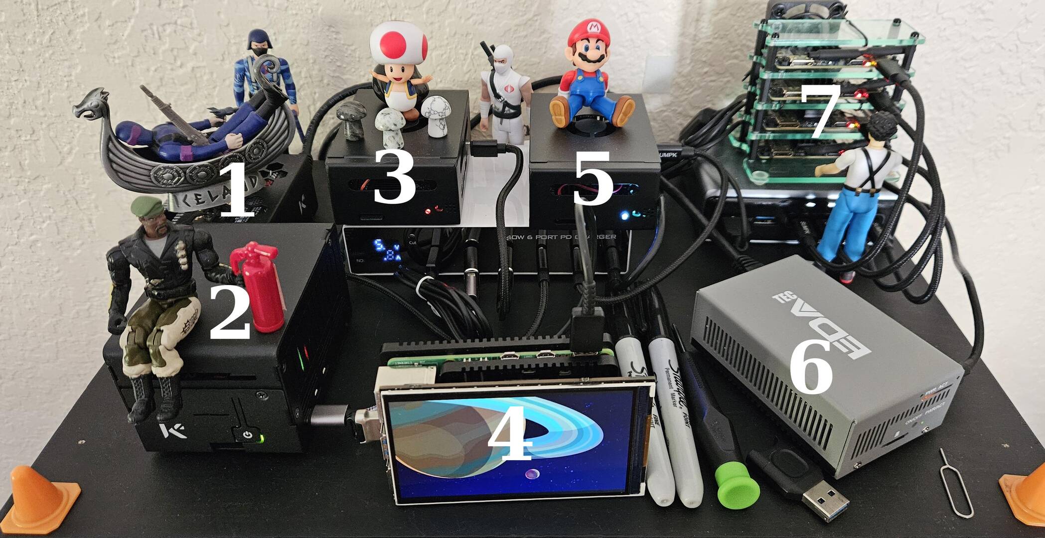 4. Raspberry Pi 5 - 8 GB, Raspberry Pi OS desktop trixie, dev machine currently hosting a Kurzegesagt picture frame on a 4" Hyperpixel display. I mostly use it to test new containers, creating containers, and Docker swarm testing (manager node)