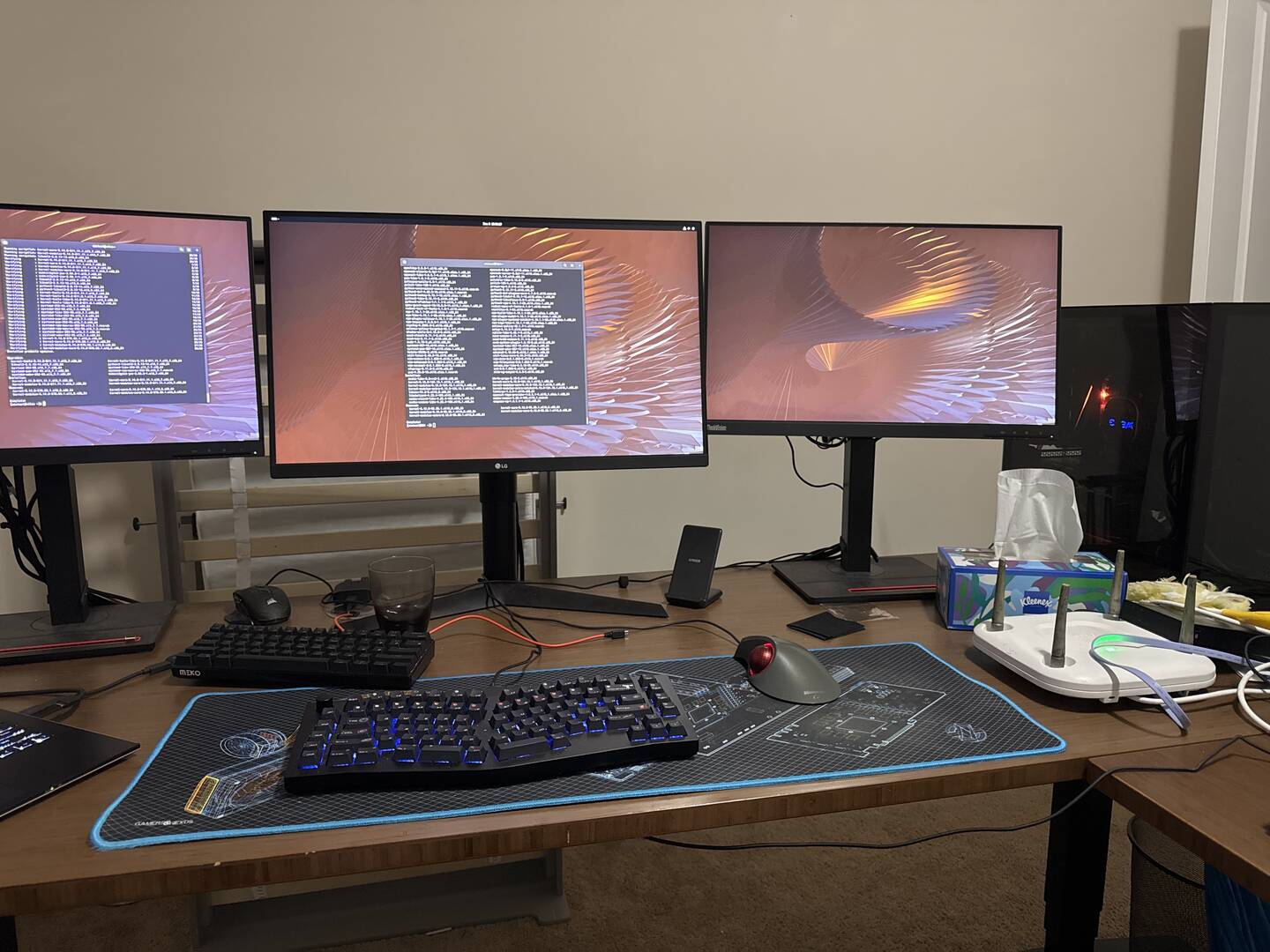 I have a 3800X, an engineering sample 11700H on a mATX, my desktop 5950X, a couple fanless mini PCs one terminal server (6x rs232) and a firewall router, and an old laptop 7700hq. All systems run Linux. The 11700 rhel8 as a hypervisor, 3800X rhel9 hypervisor, 7700 rhel10 hypervisor. Firewall rhel9. My desktop and personal laptop are Fedora 43. Storage is just a pair of 6TB spindles on my desktop shared by NFS. There is 10G SFP+ link between the desktop chassis and then the old laptop is on another port off the firewall to practice higher demand routing requirements. There is also an old Cisco access point for learning the Cisco cli