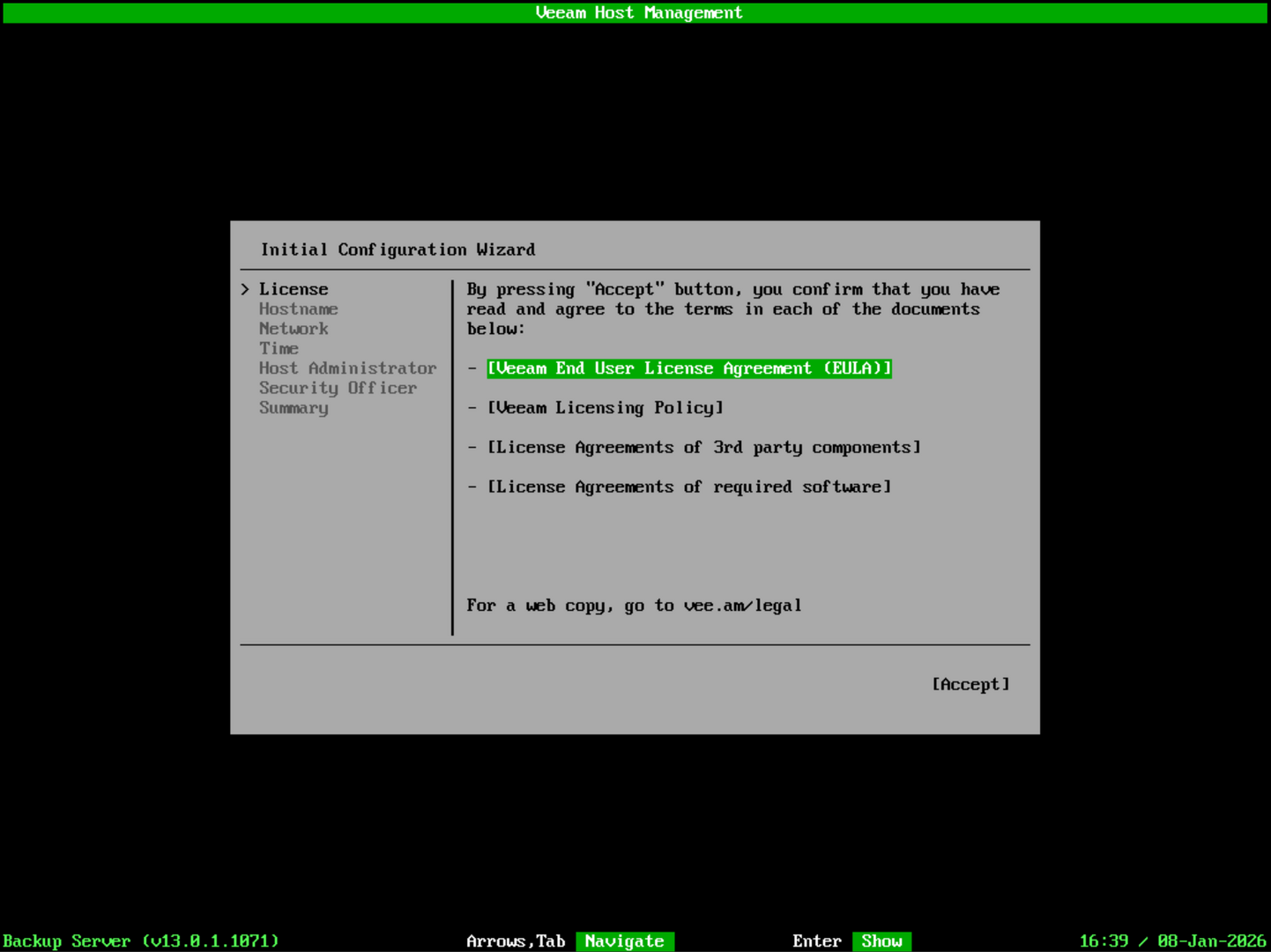 It will then kick off an initial configuration wizard for Veeam. First, accept the EULA.